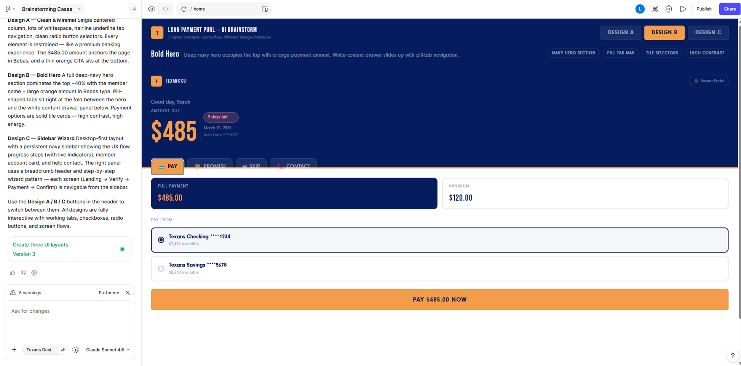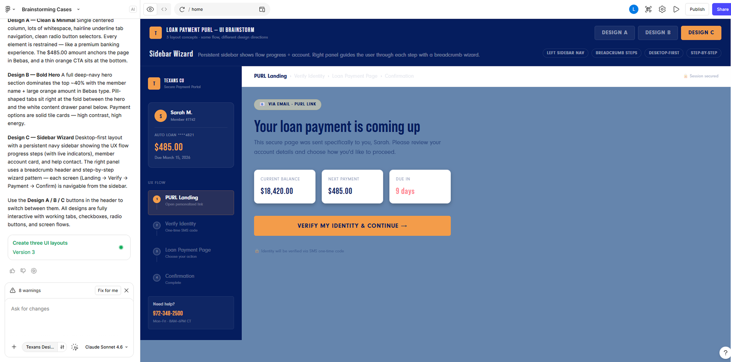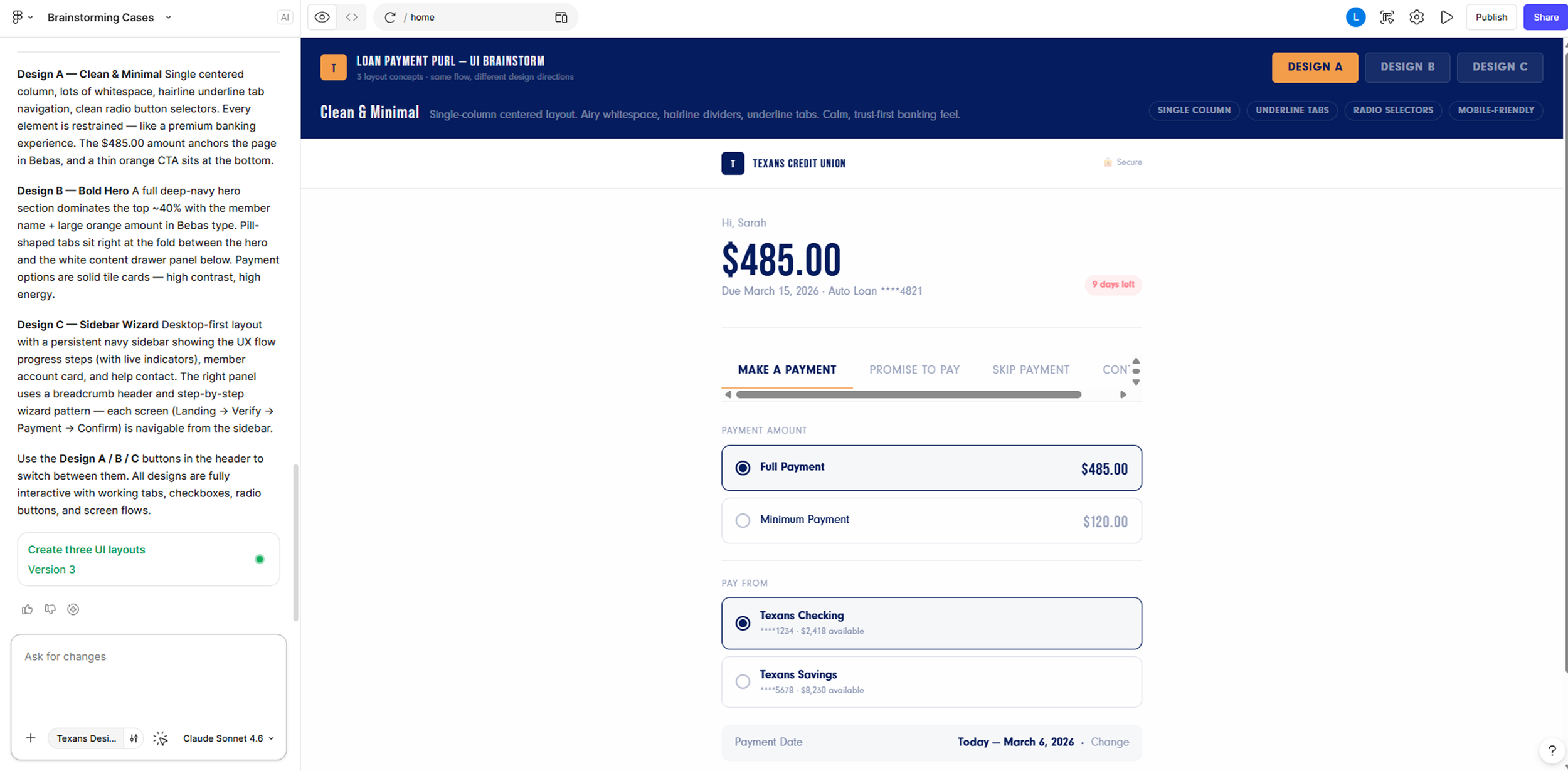 I used Figma AI to run 3 ideas of brainstorming and explore different ways to improve the loan payment experience. This process helped generate a wide range of ideas, compare options, and spot common patterns across agent workflows, system limitations, and member needs. It allowed me to quickly expand the ideas before focusing on the solutions with the greatest impact.