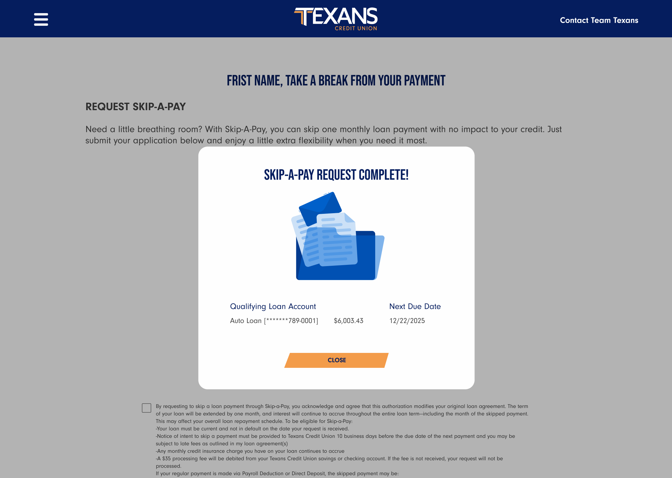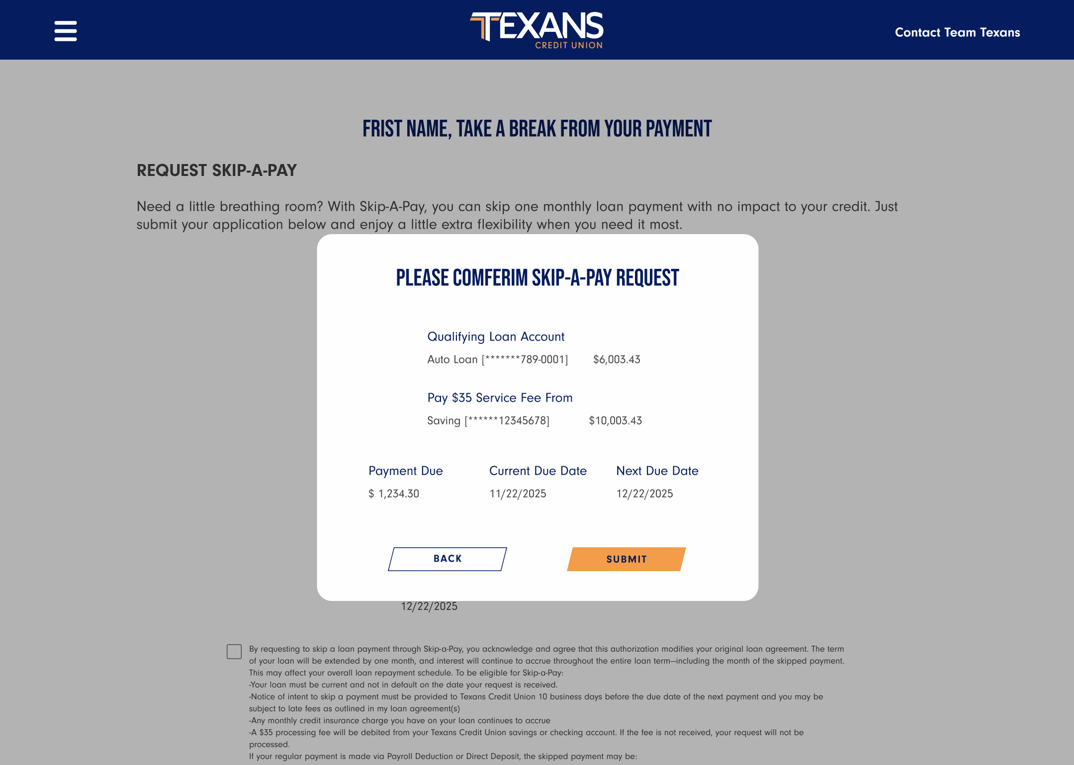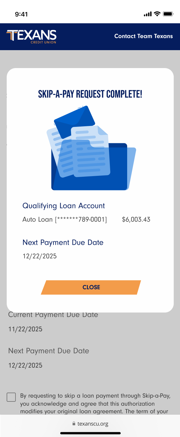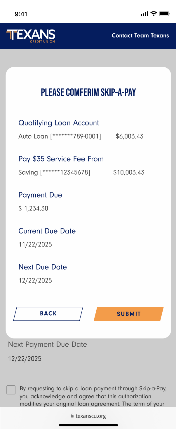Skip-a-Pay Confirmation Pop Up Page